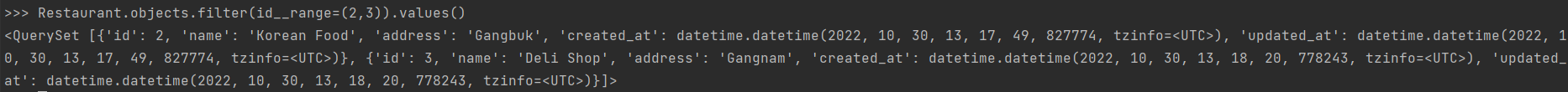 ▶ Restaurant.objects.filter(id__range=(2,3)).values() : id 필드의 값이 2부터 3 사이인 쿼리를 불러옴