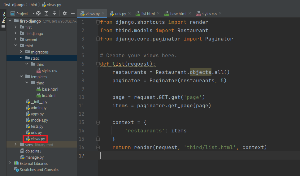 ▶ paginator = Paginator(restaurant, 5) : restaurant 변수에 담긴 값을 한 페이지에 5개씩만 출력하기 위해 페이지네이션 개념을 사용
