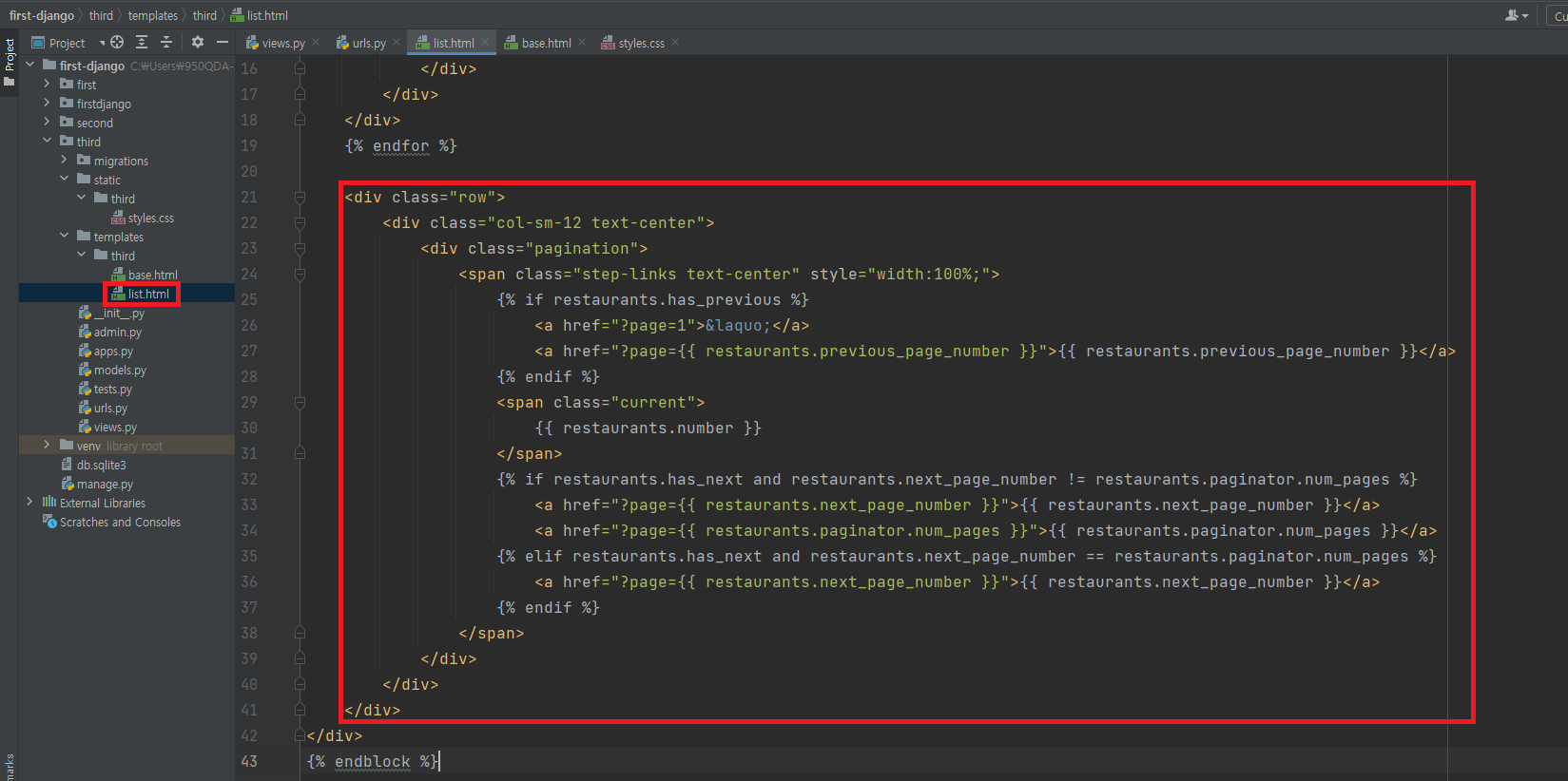 ▶ 페이지에 접속했을 때 아래쪽에 페이지 링크가 뜨도록 list.html 파일 수정