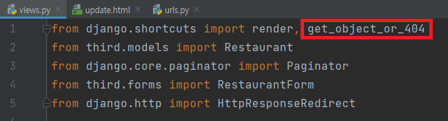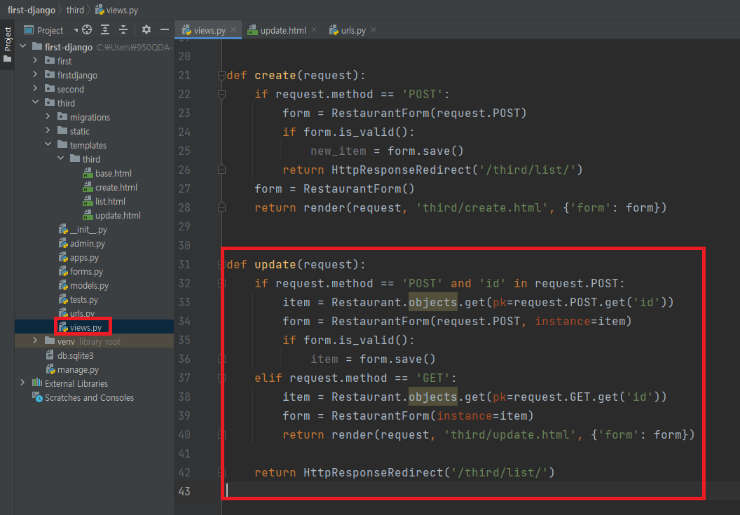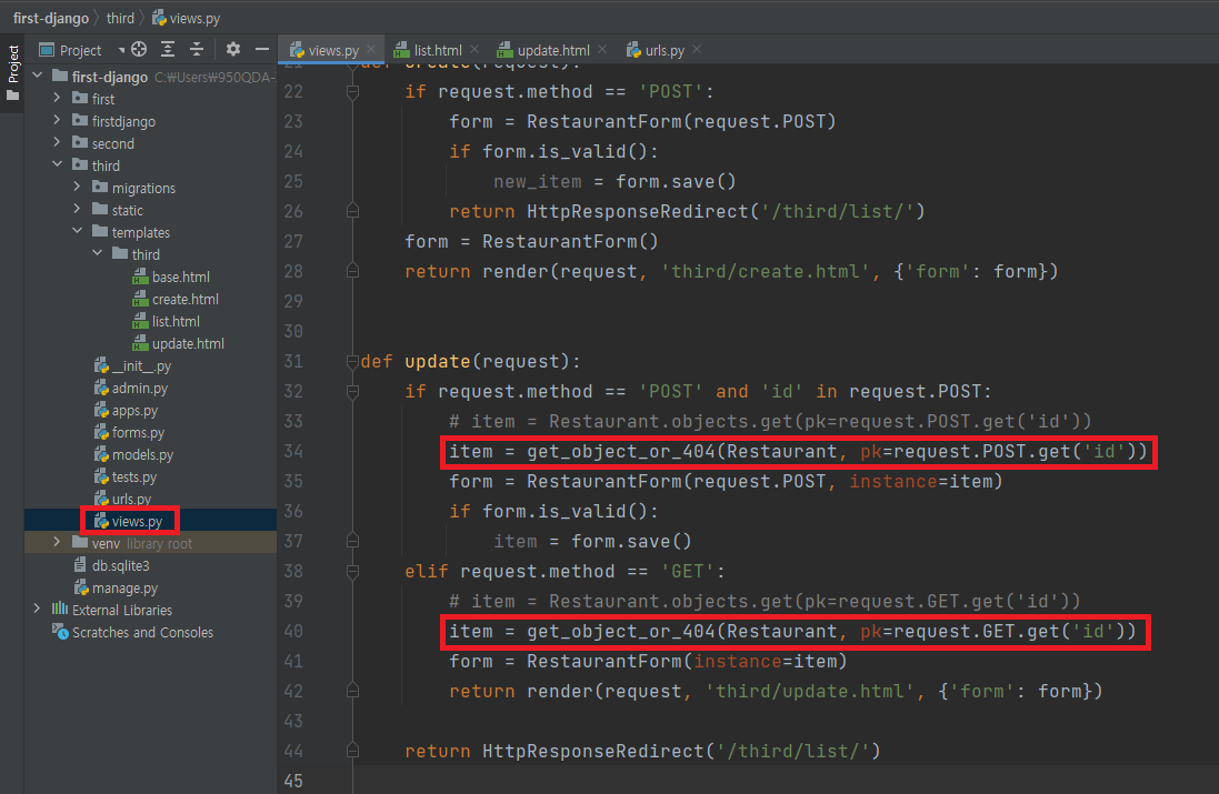 ▶ form = RestaurantForm(request.POST, instance=item) : request의 POST 데이터들을 바로 PostForm에 담고 instance의 인자(수정 대상)을 item으로 지정