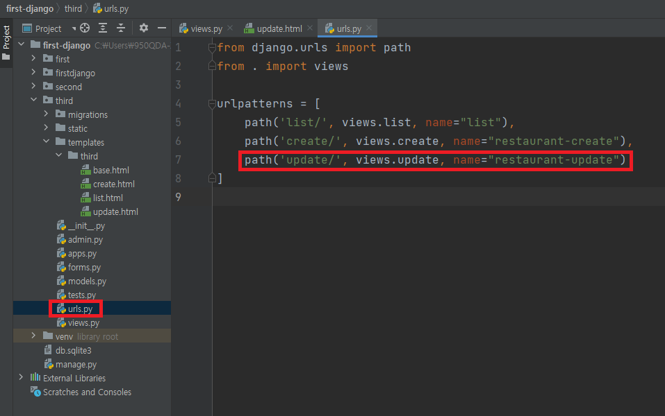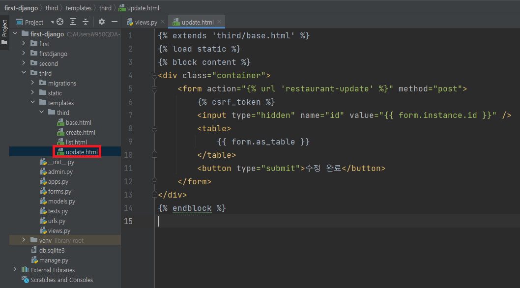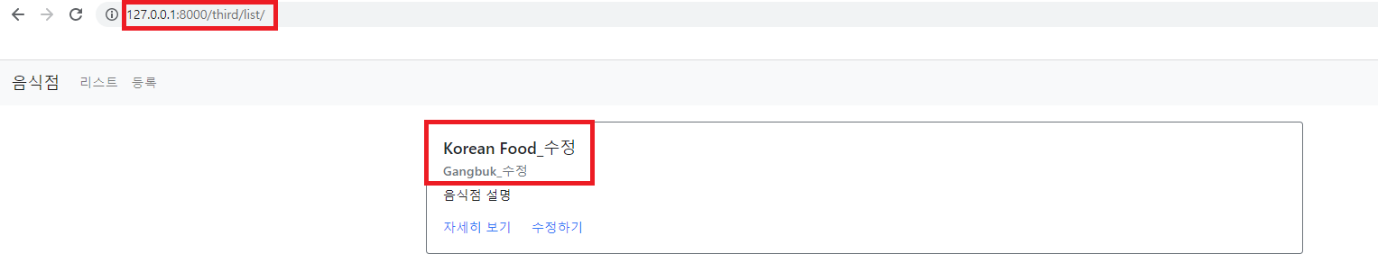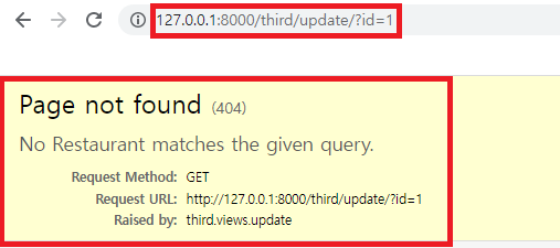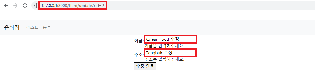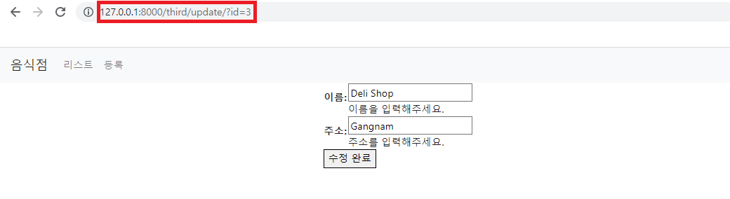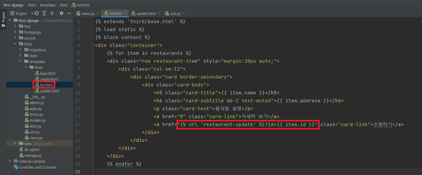 ▶ {% url 'restaurant-update' %}?id={{ item.id }} : url 경로는 urls.py 파일에 선언한 name인 restaurant-update로 선언하고 id 값은 item 인스턴스에 담긴 id 값으로 불러옴