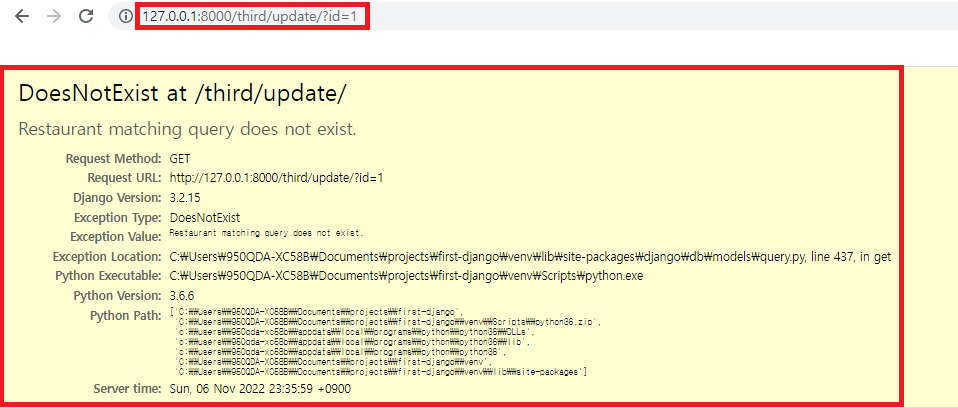 ▶ id값이 존재하지 않는 경로로 접속했을 때 나오는 화면(DoesNotExist 오류 발생)