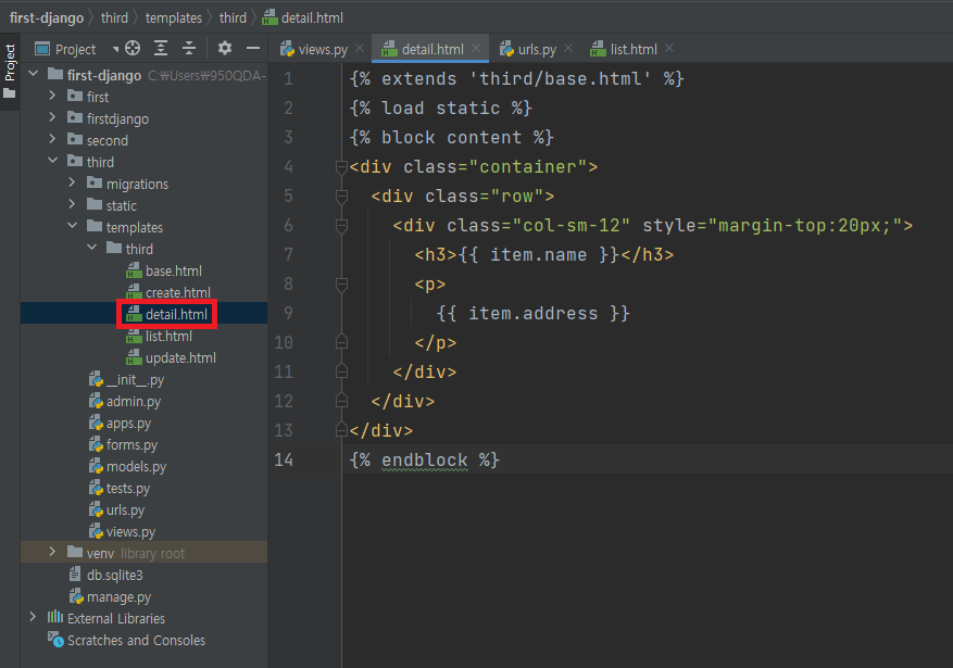 return render(request, 'third/detail.html', {'item': item})
