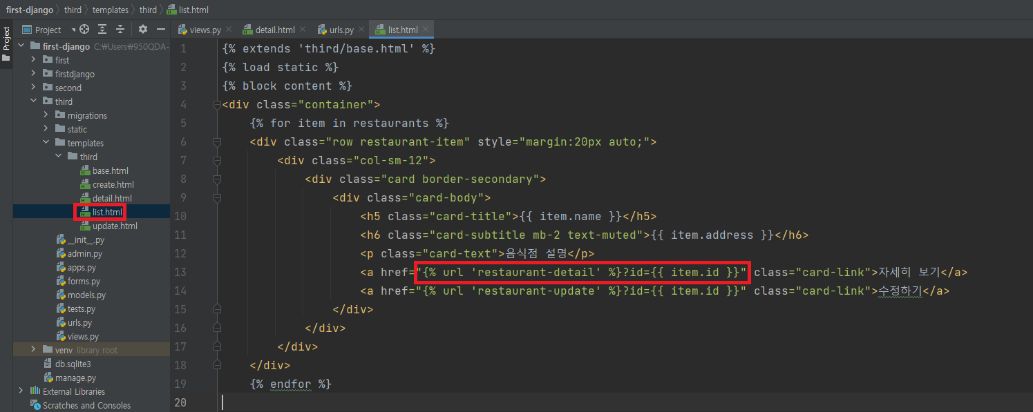 <a href="{% url 'restaurant-update' %}?id={{ item.id }}" class="card-link">수정하기</a>