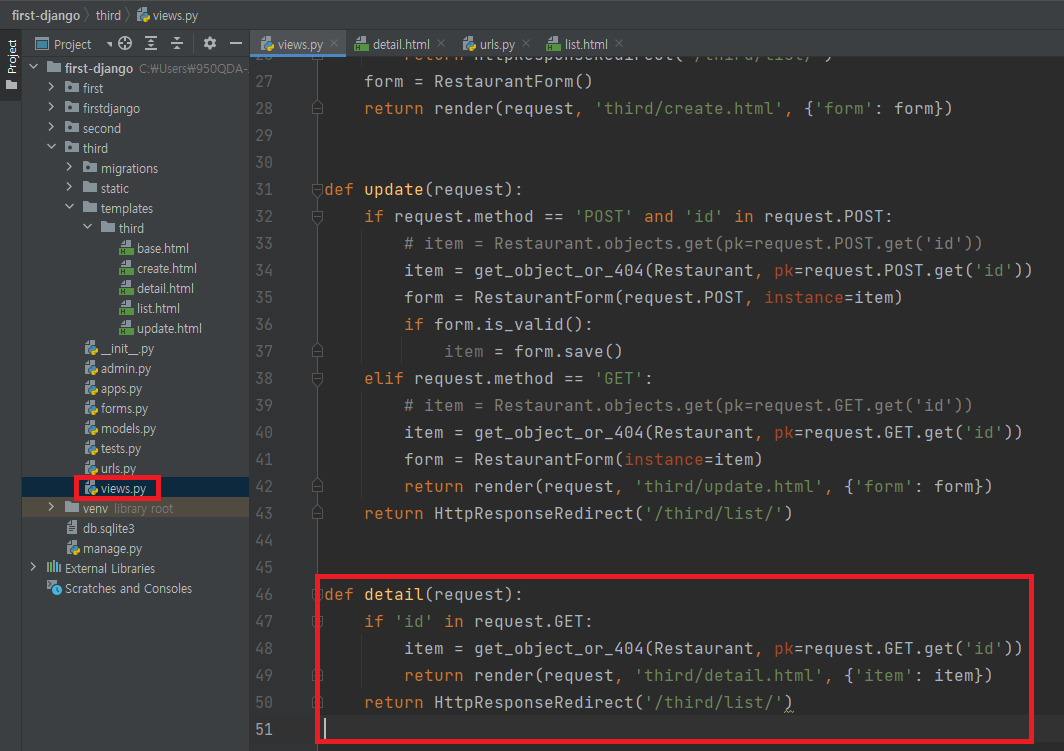 ▶ views.py 파일에 detail 메소드 추가