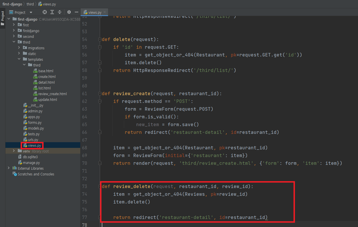 ▶ def review_delete(request, restaurant_id, review_id) : url path parameter로 restaurant_id와 review_id를 넘겨줌