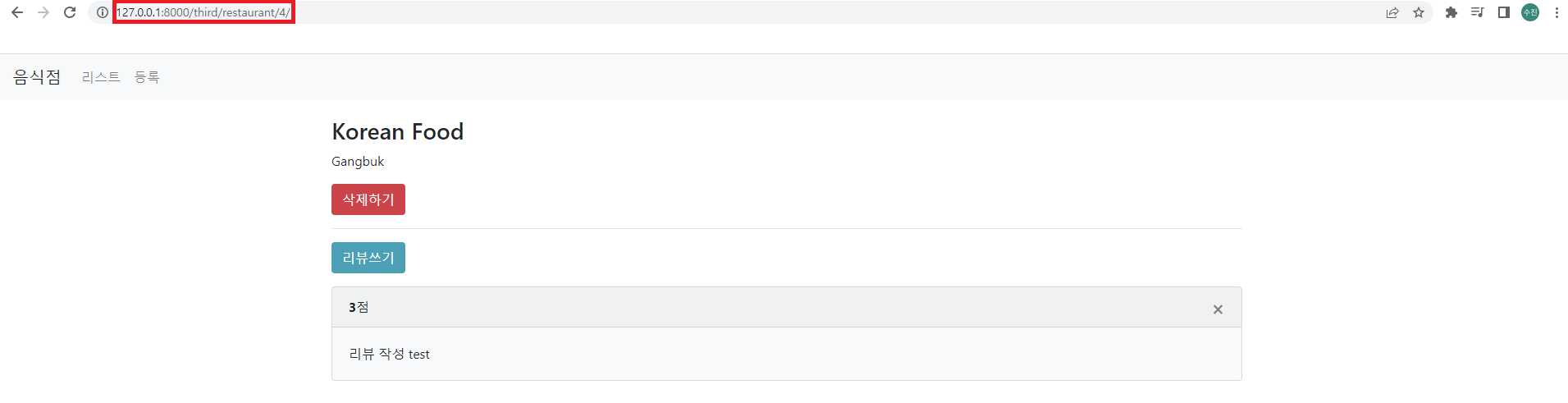 ▶ return redirect('restaurant-detail', id=restaurant_id) : detail 화면으로 돌아감