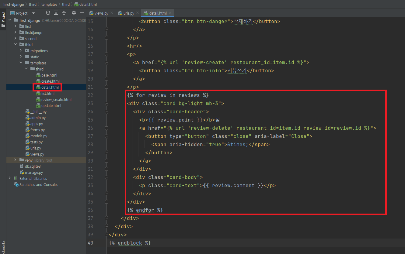 return render(request, 'third/detail.html', {'item': item, 'reviews': reviews})
