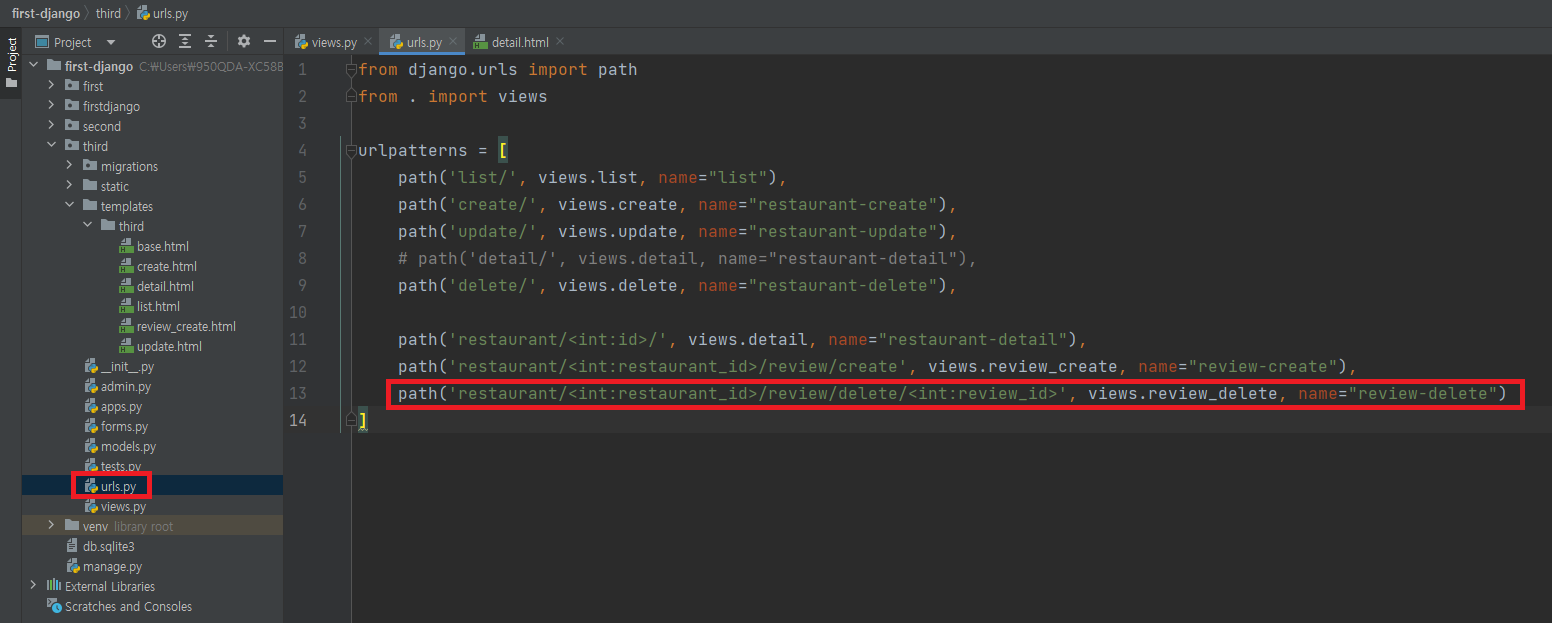 ▶ urls.py에 review_delete 화면 경로를 추가