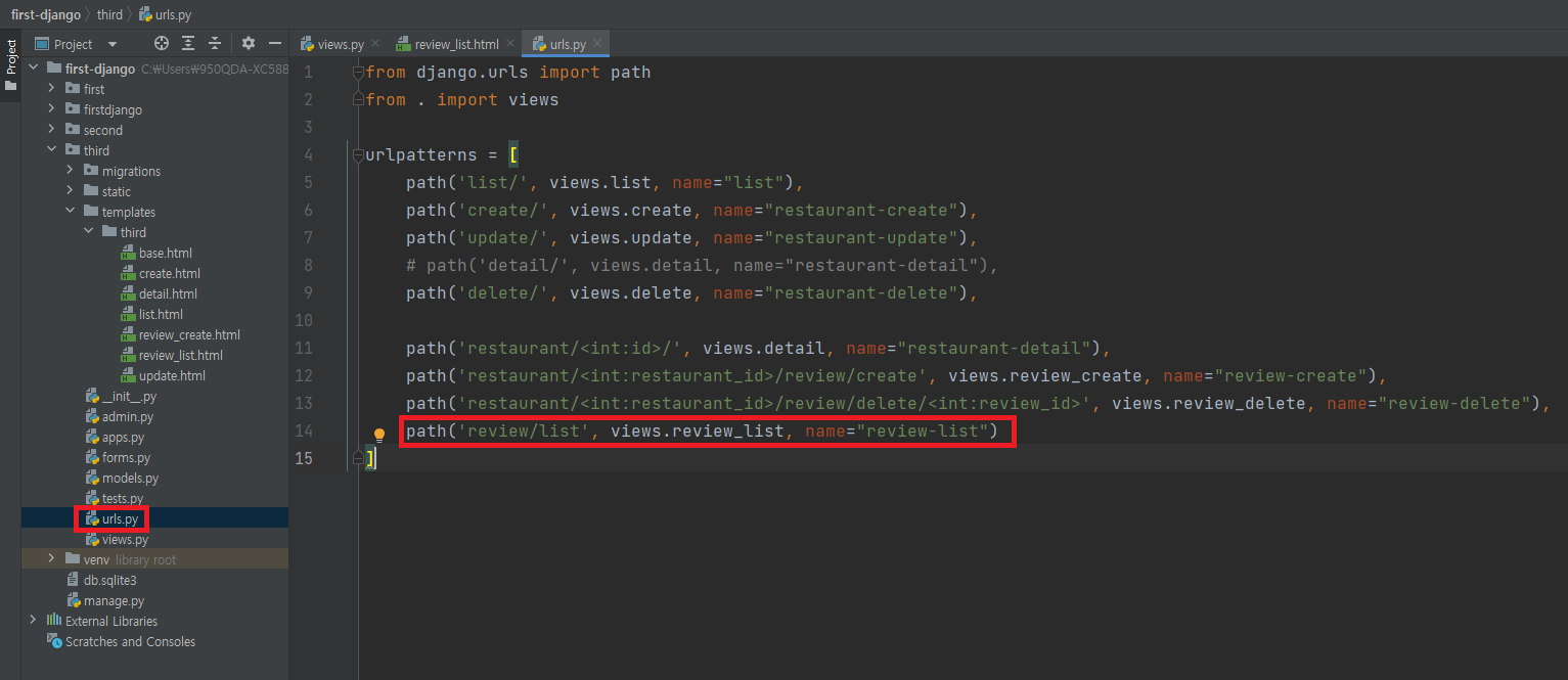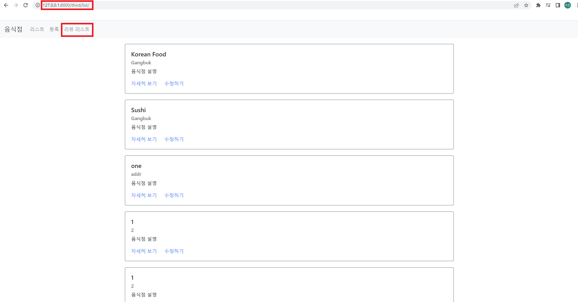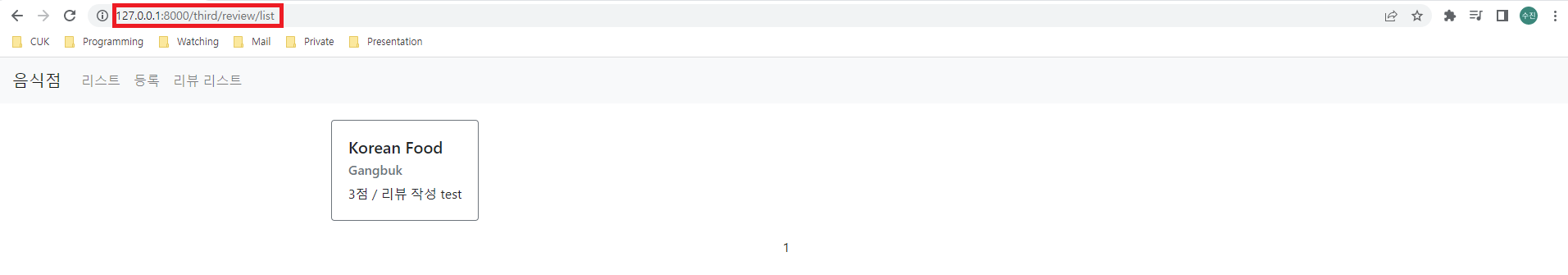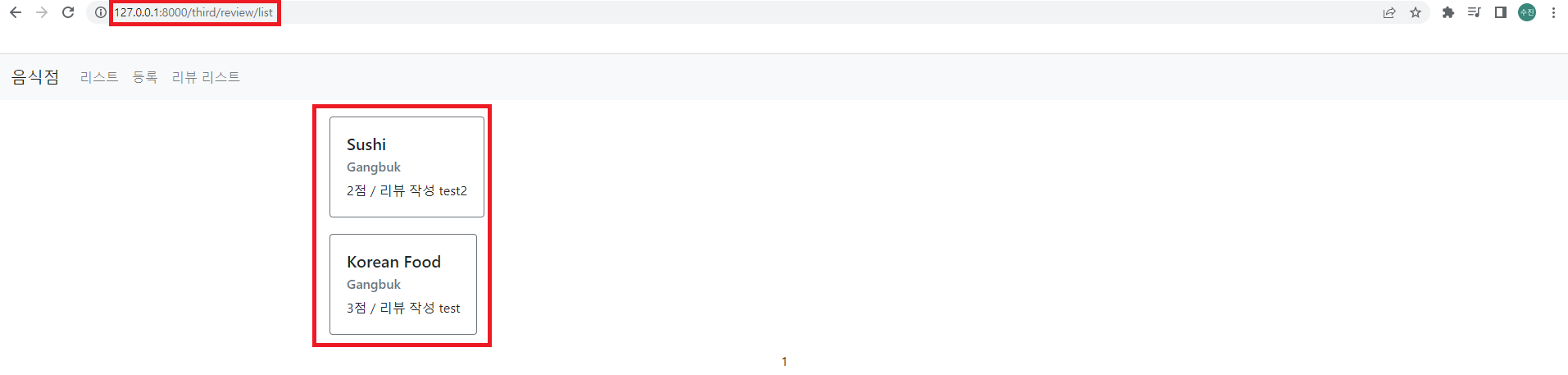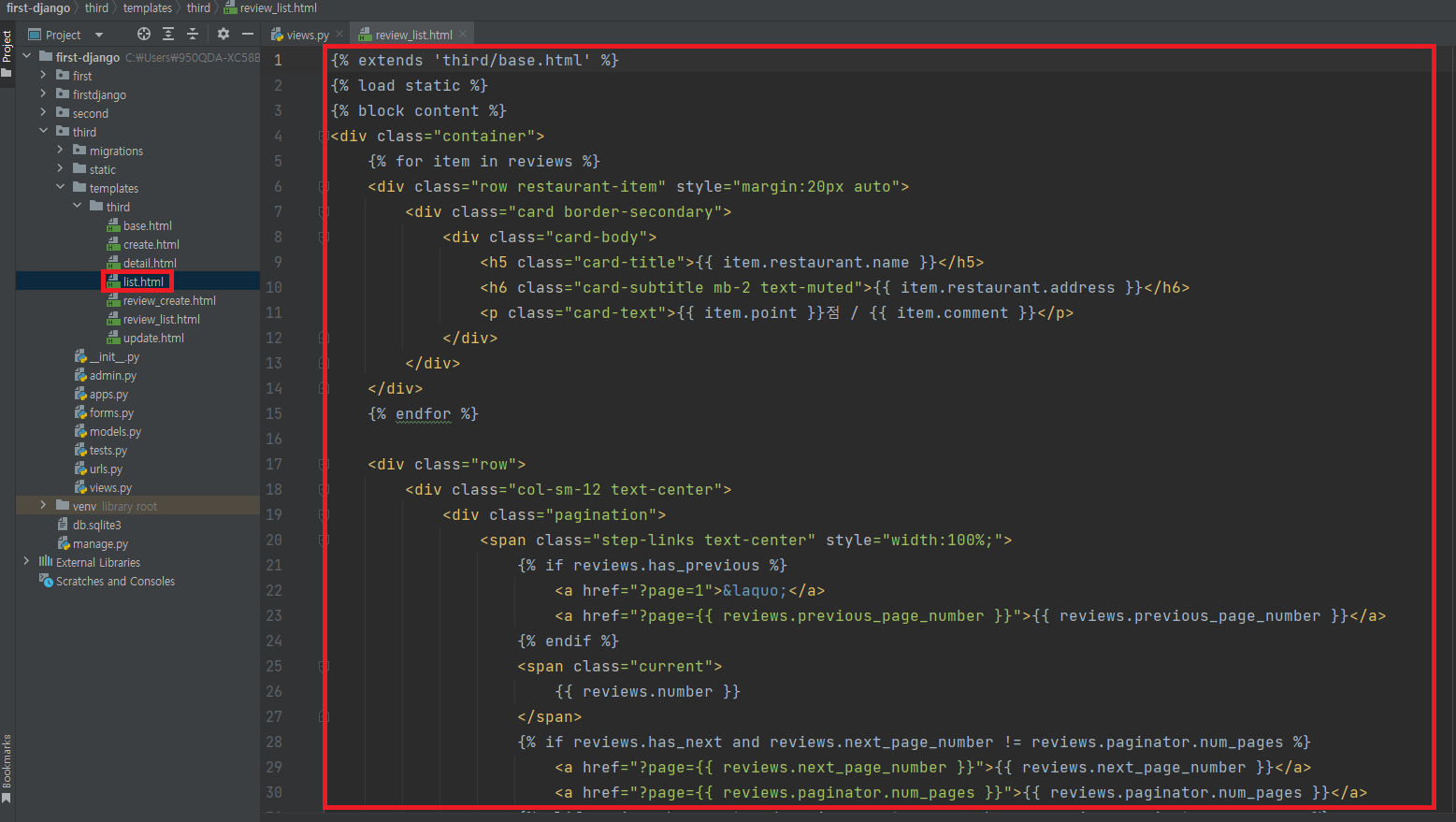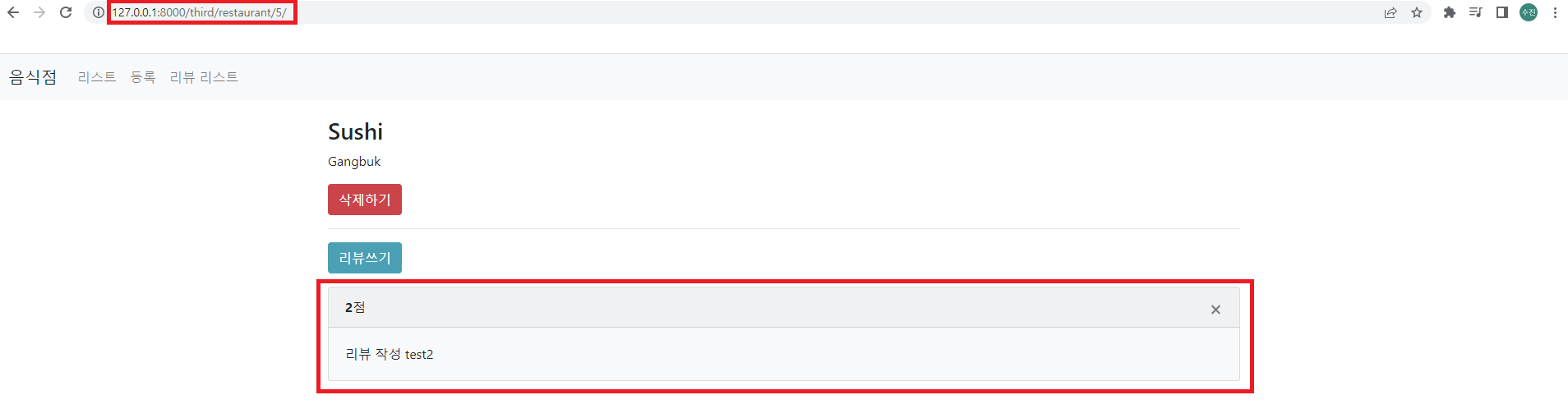 ▶ {{ item.restaurant.(Restaurant 모델에 정의된 속성) }} : Review와 Restaurant의 relation이 models.py에 정의되어 있기 때문에 리뷰 데이터에 연관된 음식점의 데이터에 접근할 수 있음