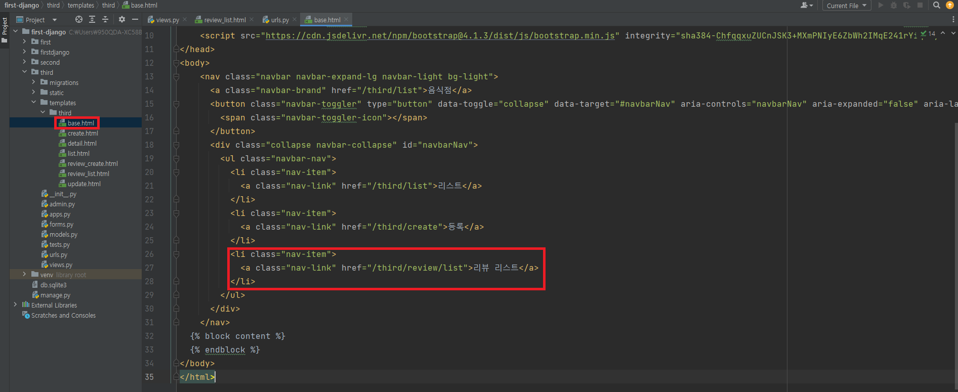 ▶ 기존에 있던 base.html 파일에 리뷰 리스트 링크 추가