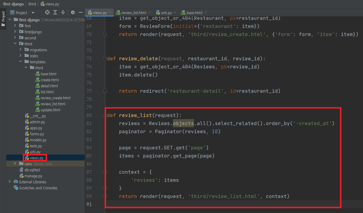 ▶ paginator = Paginator(reviews, 10) : 한 페이지에 10개씩 표시