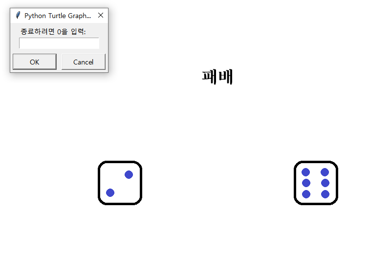 dice=turtle.textinput("", "종료하려면 0을 입력: ")