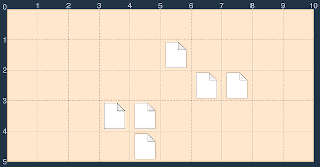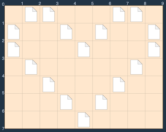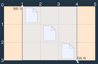 이러한 바탕화면에서 다음 그림과 같이 S(0, 1)에서 E(3, 4)로 드래그하면 세 개의 파일이 모두 선택되므로 드래그 한 거리 (3 - 0) + (4 - 1) = 6을 최솟값으로 모든 파일을 선택 가능합니다.