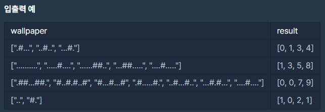 컴퓨터 바탕화면은 각 칸이 정사각형인 격자판입니다. 이때 컴퓨터 바탕화면의 상태를 나타낸 문자열 배열 wallpaper가 주어집니다. 파일들은 바탕화면의 격자칸에 위치하고 바탕화면의 격자점들은 바탕화면의 가장 왼쪽 위를 (0, 0)으로 시작해 (세로 좌표, 가로 좌표)로 표현합니다. 빈칸은 ".", 파일이 있는 칸은 "#"의 값을 가집니다. 드래그를 하면 파일들을 선택할 수 있고, 선택된 파일들을 삭제할 수 있습니다. 머쓱이는 최소한의 이동거리를 갖는 한 번의 드래그로 모든 파일을 선택해서 한 번에 지우려고 하며 드래그로 파일들을 선택하는 방법은 다음과 같습니다.