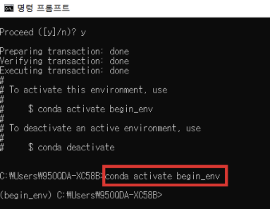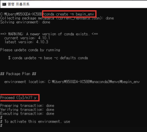 2. 가상 환경을 생성하기 위한 아나콘다 명령어 입력 → y 입력