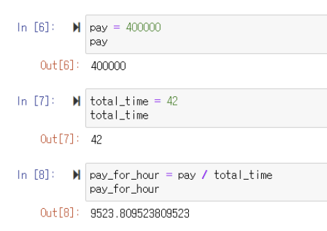 - pay를 total_time으로 나눈 값을 pay_for_hour 변수에 넣고 출력해라