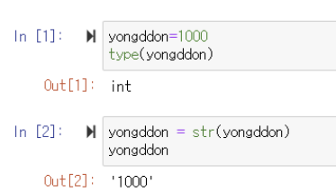 ▶️ yongddon이라는 변수에는 1000이라는 정수가 입력되어 있어 type을 출력하면 정수형(int)임을 알려줌