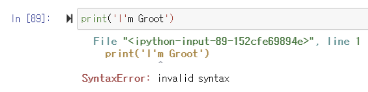 ▶️ I'm Groot 문자를 감싸고 있는 작은 따옴표와 I 뒤에 쓴 작은 따옴표가 겹쳐 오류가 발생함