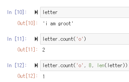 ▶️ letter.count('o', 8, len(letter)) : o라는 문자를 8번 인덱스부터 문자열의 총 길이끝까지 찾았을 때 1개 존재함