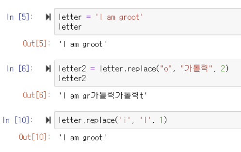 ▶️ letter2 = letter.replace("o", "가톨릭", 2) : letter2 변수를 새로 만들어 letter 문자열에서 'o' 문자를 '가톨릭'으로 총 2번 바꿔 저장함