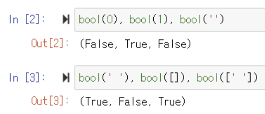 - ' ', 빈 자료([ ], ( ), { }, ...) ⇒ False를 의미함