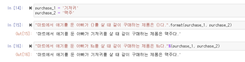 아래 데이터를 이용해 '마트에서 애기를 둔 아빠가 기저귀를 살 때 같이 구매하는 제품은 맥주다.'를 변수를 사용해 출력해보자.