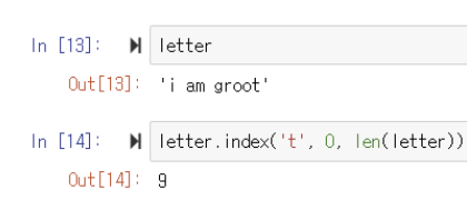 ▶️ letter.index('t', 0, len(letter)) : letter 문자열에서 0부터 문자열 끝까지 찾았을 때 9번째에 t 문자가 존재함
