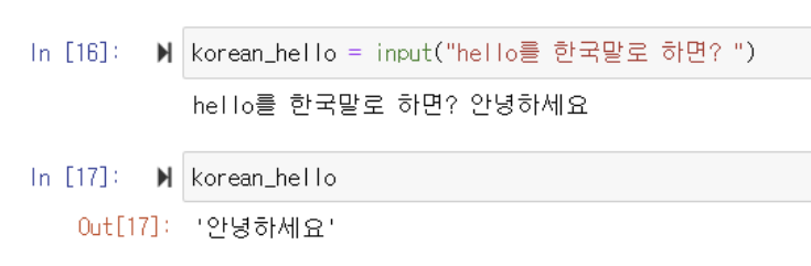 ▶️ korean_hello = input("hello를 한국말로 하면?") : korean_hello라는 변수에 사용자가 "hello를 한국말로 하면?"이라는 질문에 입력한 값을 저장함
