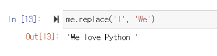 me 변수에 저장된 문자열에서 I를 We로 바꿔보자.
