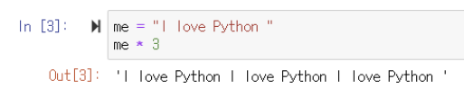 "I love Python"을 me 변수에 넣고 3번 출력해보자.