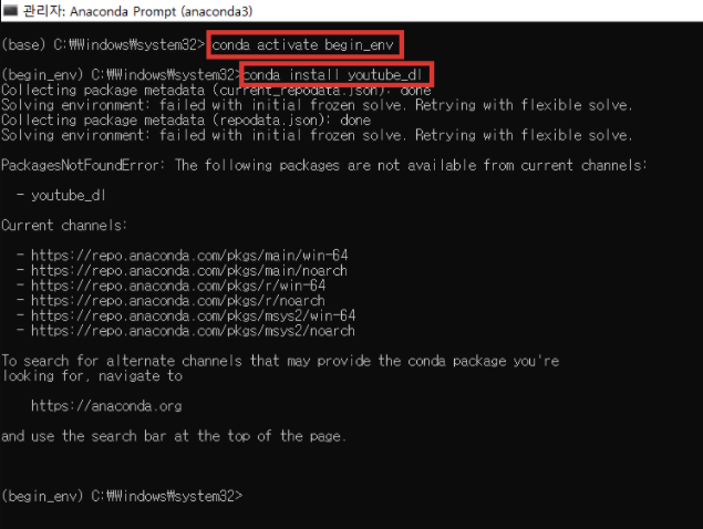 ▶️ conda를 활성화 시켜 youtube 영상을 다운받을 수 있는 디렉토리를 실행시킴