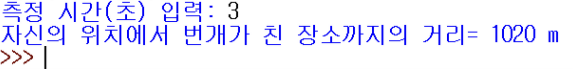 print("자신의 위치에서 번개가 친 장소까지의 거리=", distance, "m")