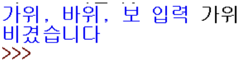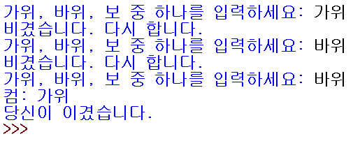 ▶ 사용자로부터 가위, 바위, 보 중 하나를 입력받고, 이를 제외한 다른 말을 입력하면 잘못 입력했음을 안내해줌