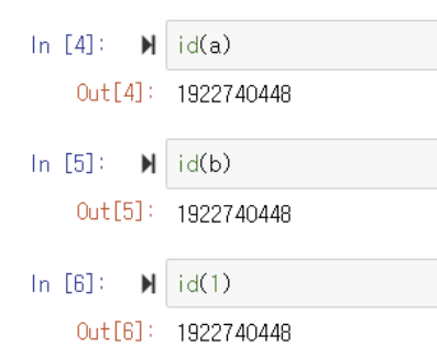 ▶️ 변수는 메모리 주소를 갖기 때문에 a, b, 1의 메모리 주소를 출력해보면 동일한 값이 나옴