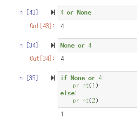 ▶️ None의 경우 False, 4는 True이기 때문에 False or True 혹은 True or False는 True값이 출력됨